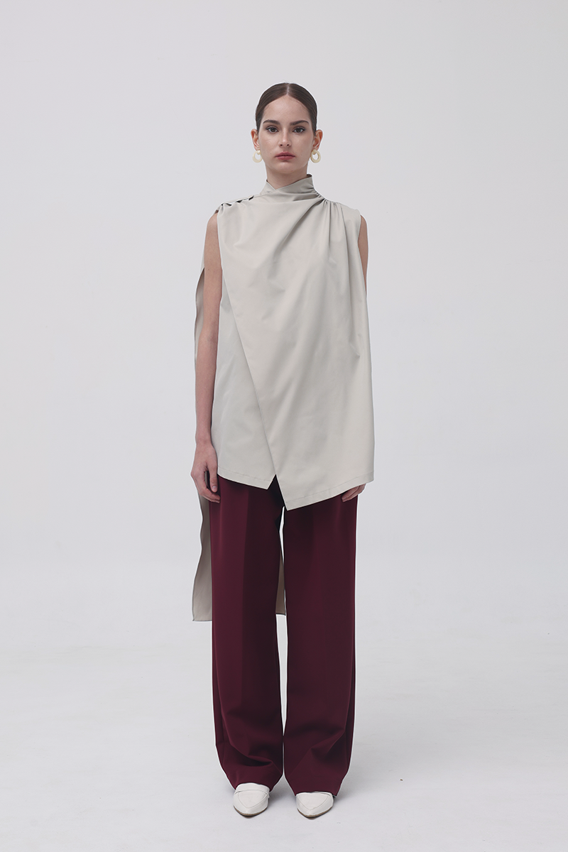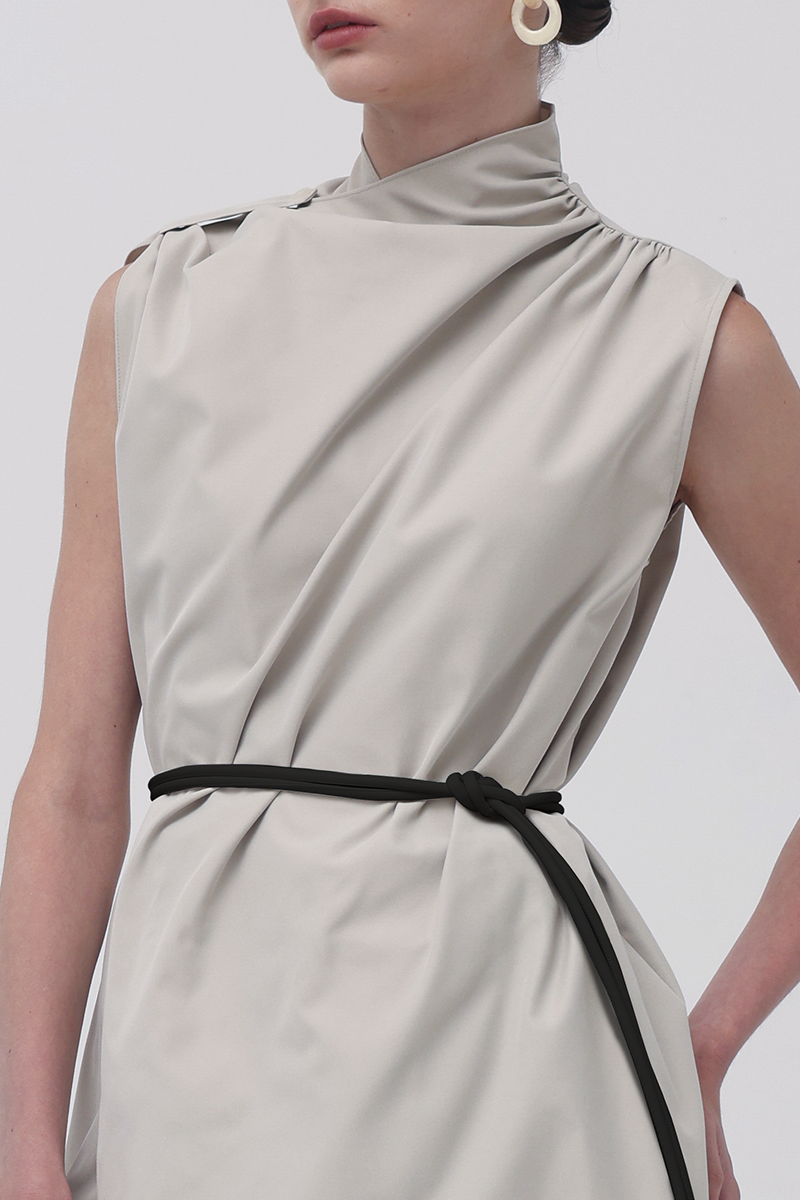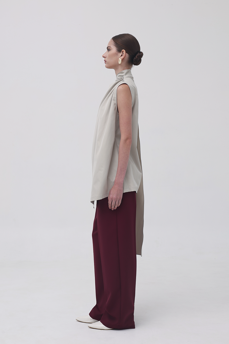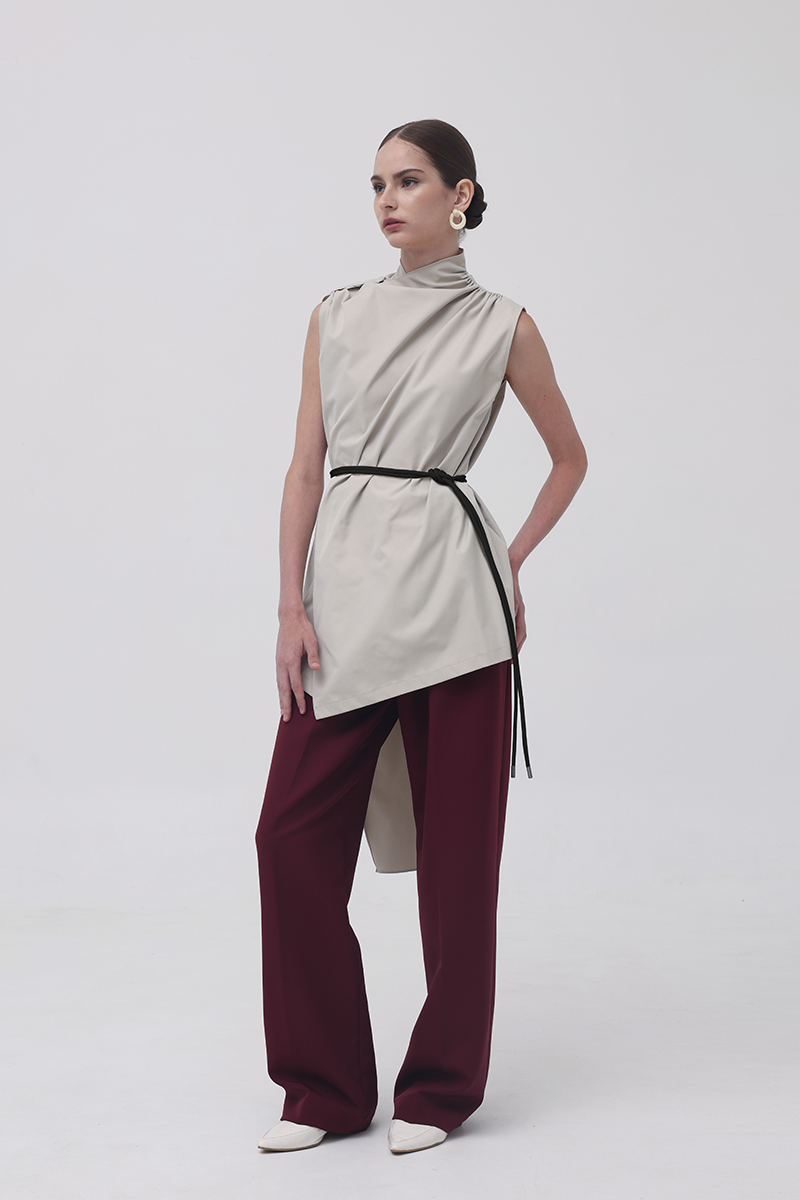 In Beige, the Baba Scarf Top leans into a sophisticated, modern palette. The soft neutral tone enhances its architectural drape, while the contrasting black belt adds a sharp, defined finish when styled cinched with the belt-already included in every purchase. The long scarf panel creates movement with every step, giving the top an effortlessly elongated, contemporary silhouette.