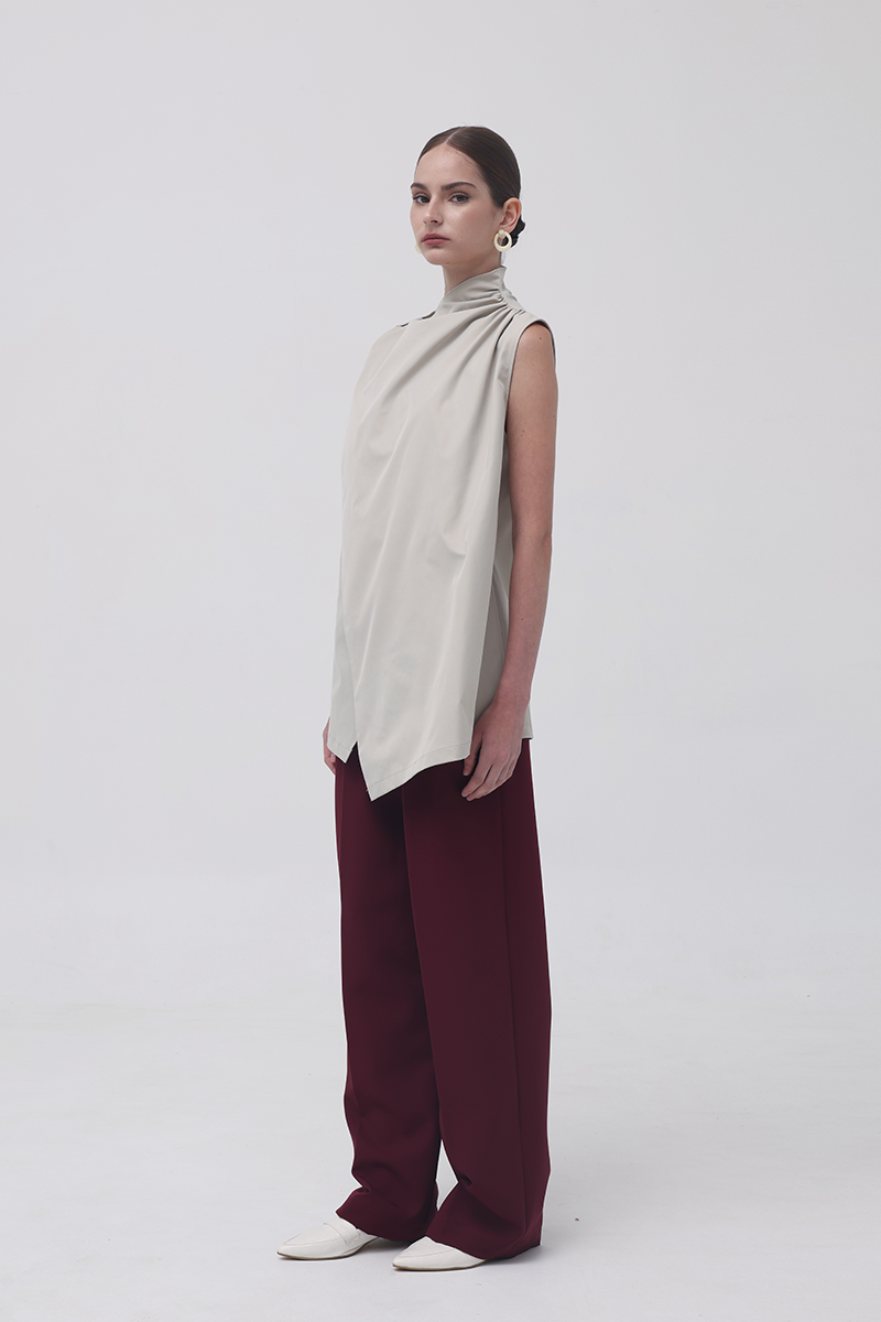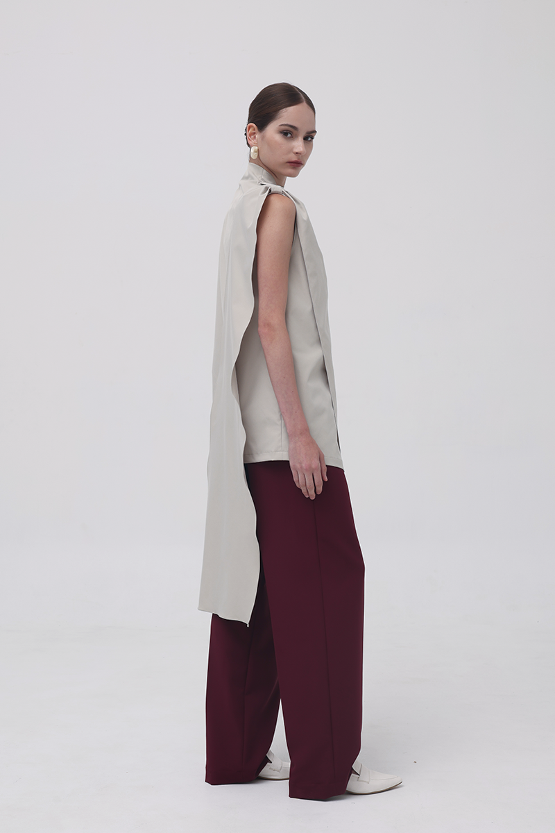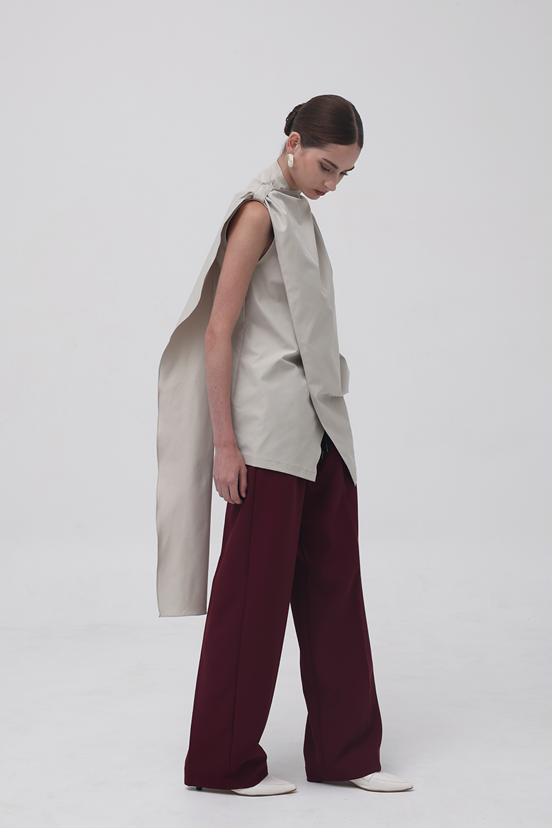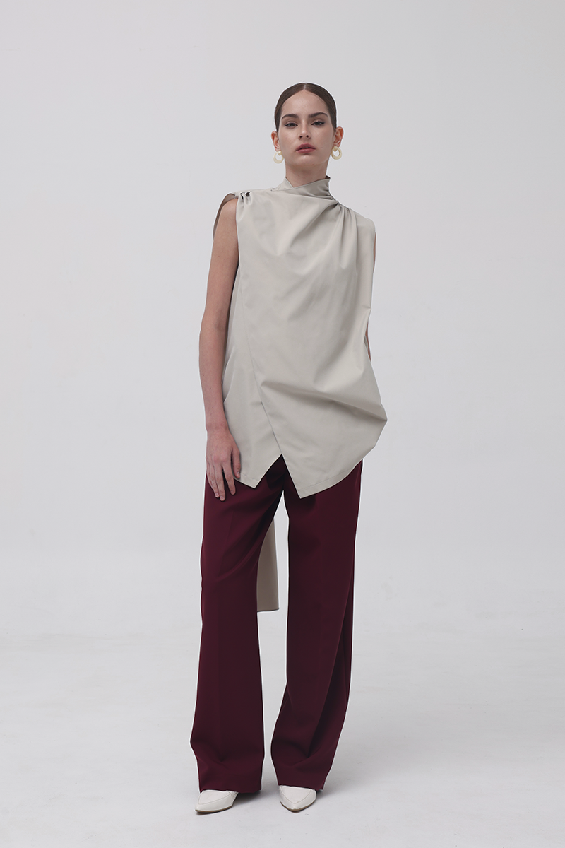 In Beige, the Baba Scarf Top leans into a sophisticated, modern palette. The soft neutral tone enhances its architectural drape, while the contrasting black belt adds a sharp, defined finish when styled cinched with the belt-already included in every purchase. The long scarf panel creates movement with every step, giving the top an effortlessly elongated, contemporary silhouette.