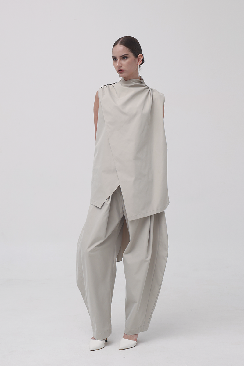 Pair the Beige version with ‘Black Sarah Barrel Pants’ for a sleek contrast, or with ‘Beige Sarah Barrel Pants’ for a refined monochrome look. Wear it belted for dinners, meetings, or events where you want a structured presence—or unbelted for a more relaxed, fluid elegance. Just like the White, it’s also easy to adapt for hijab styling with a simple inner layer.