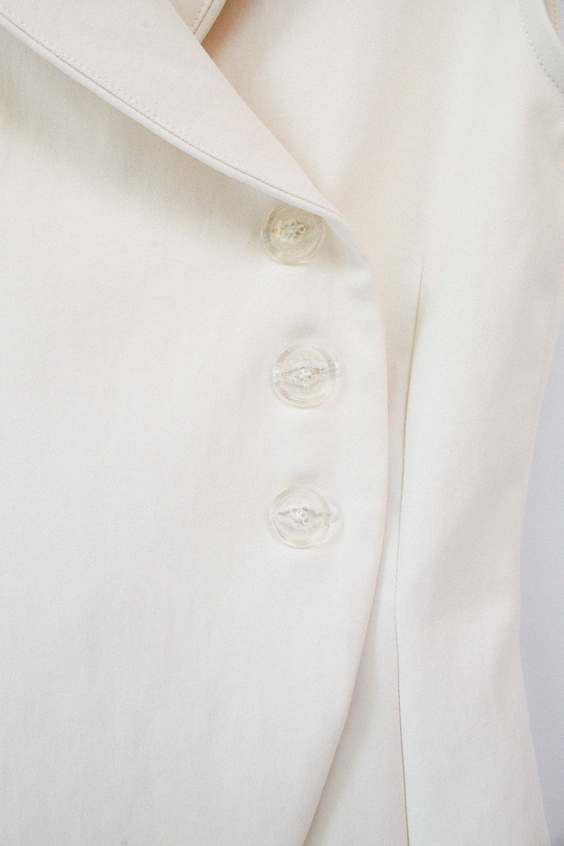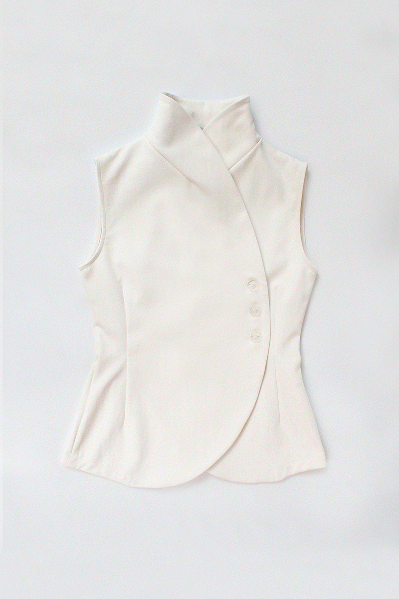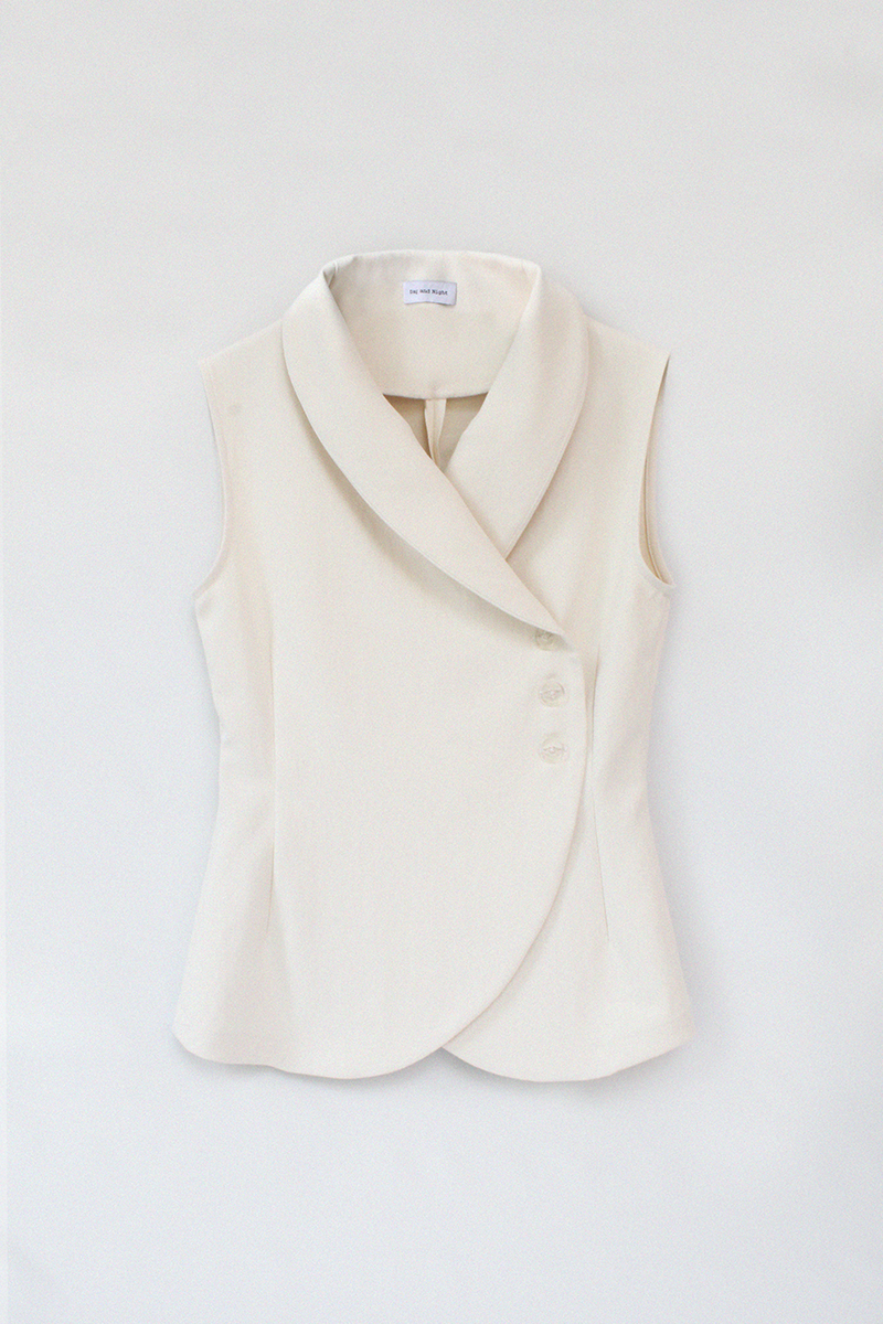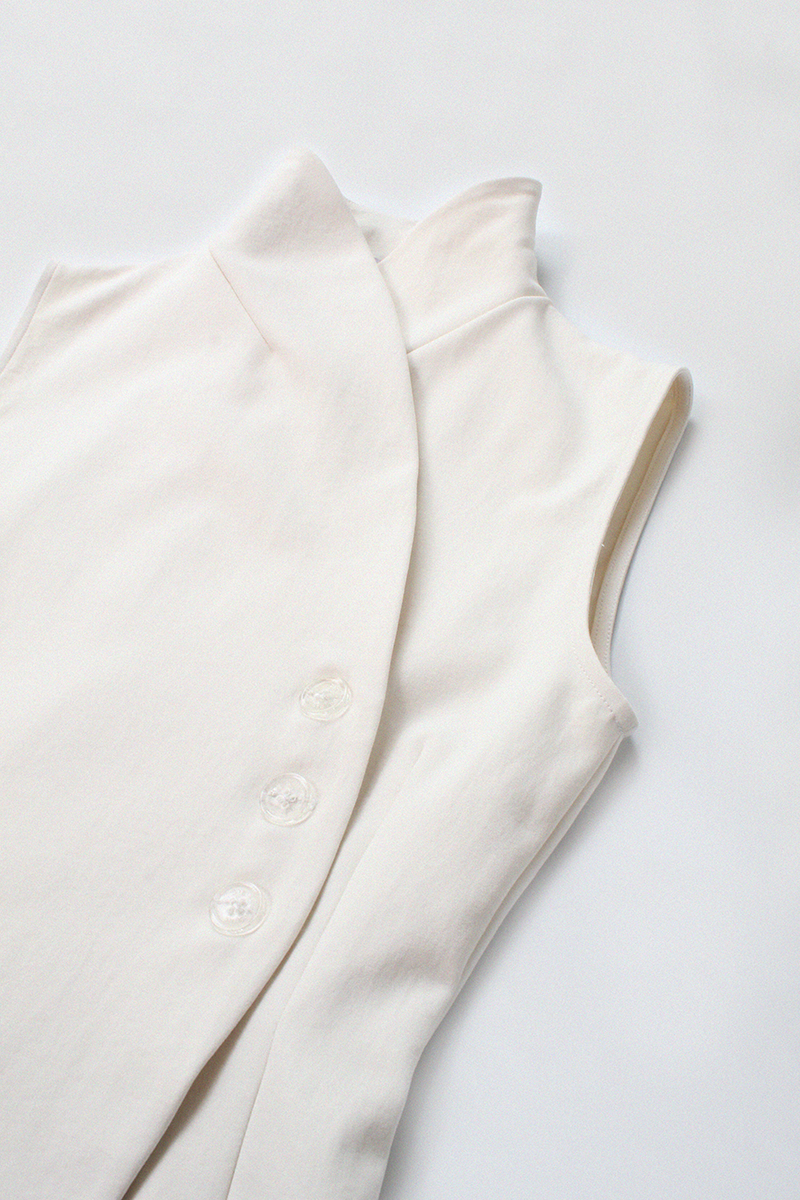 The Creme Vest features an asymmetrical wrap front and sculpted collar, it adds instant polish to any look. The smooth cotton-polyester blend keeps it light and refined, perfect for layering or wearing on its own.