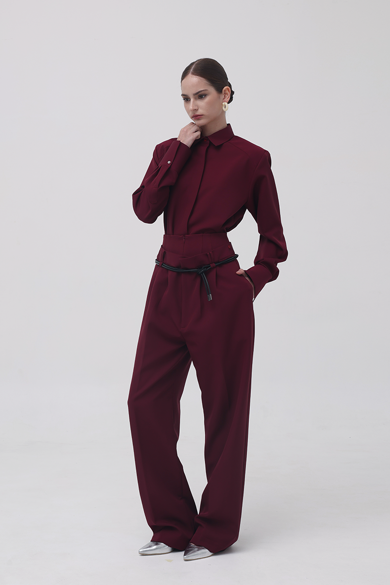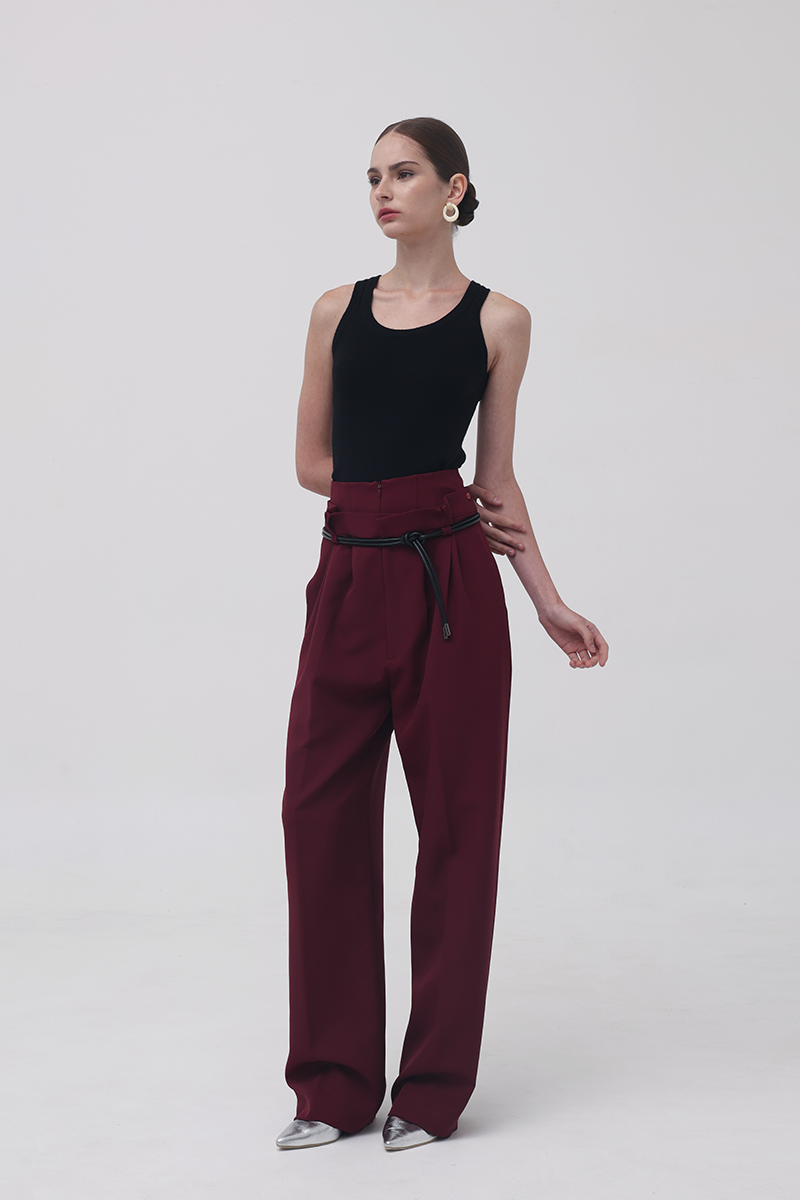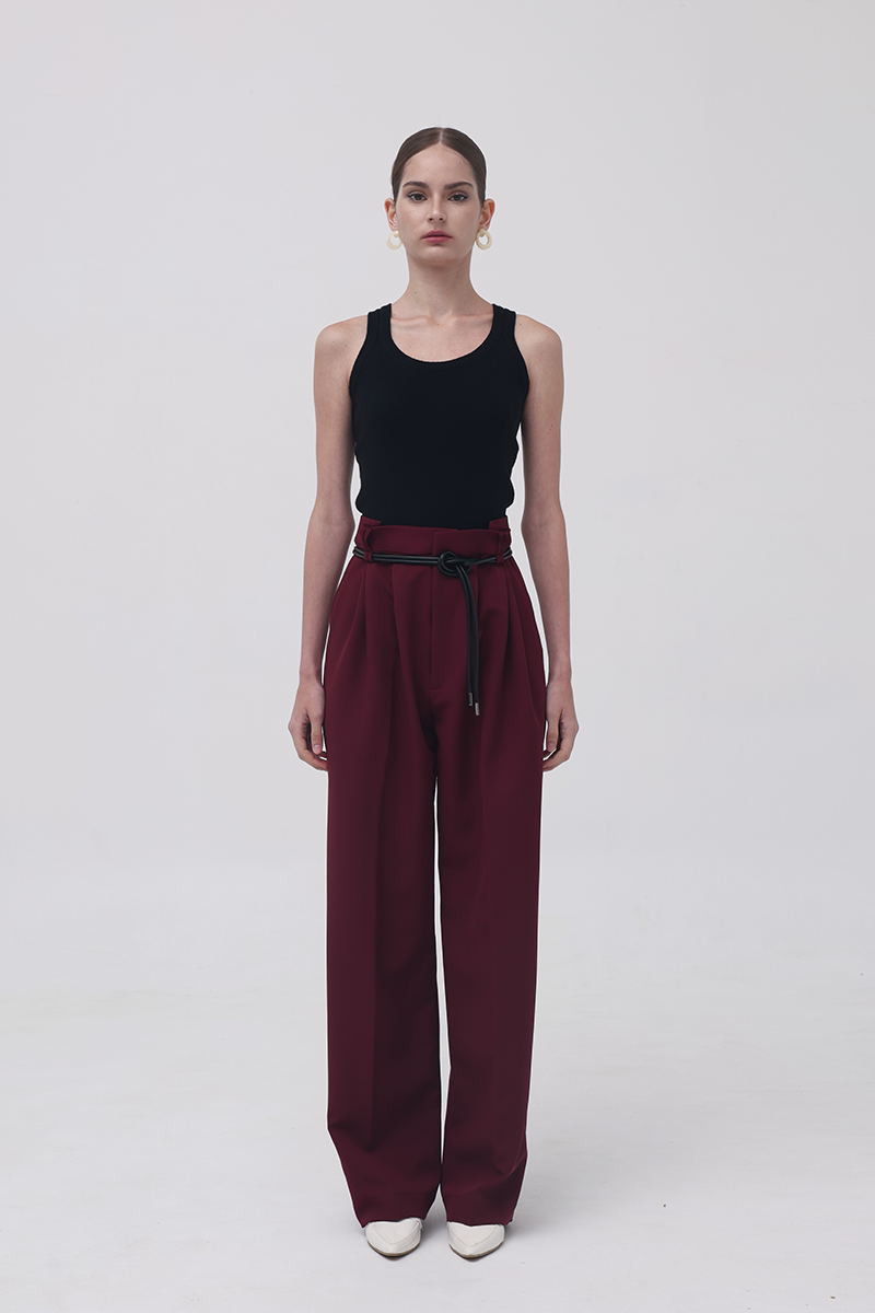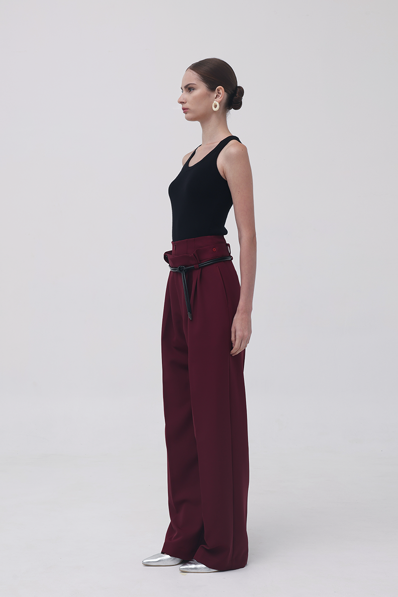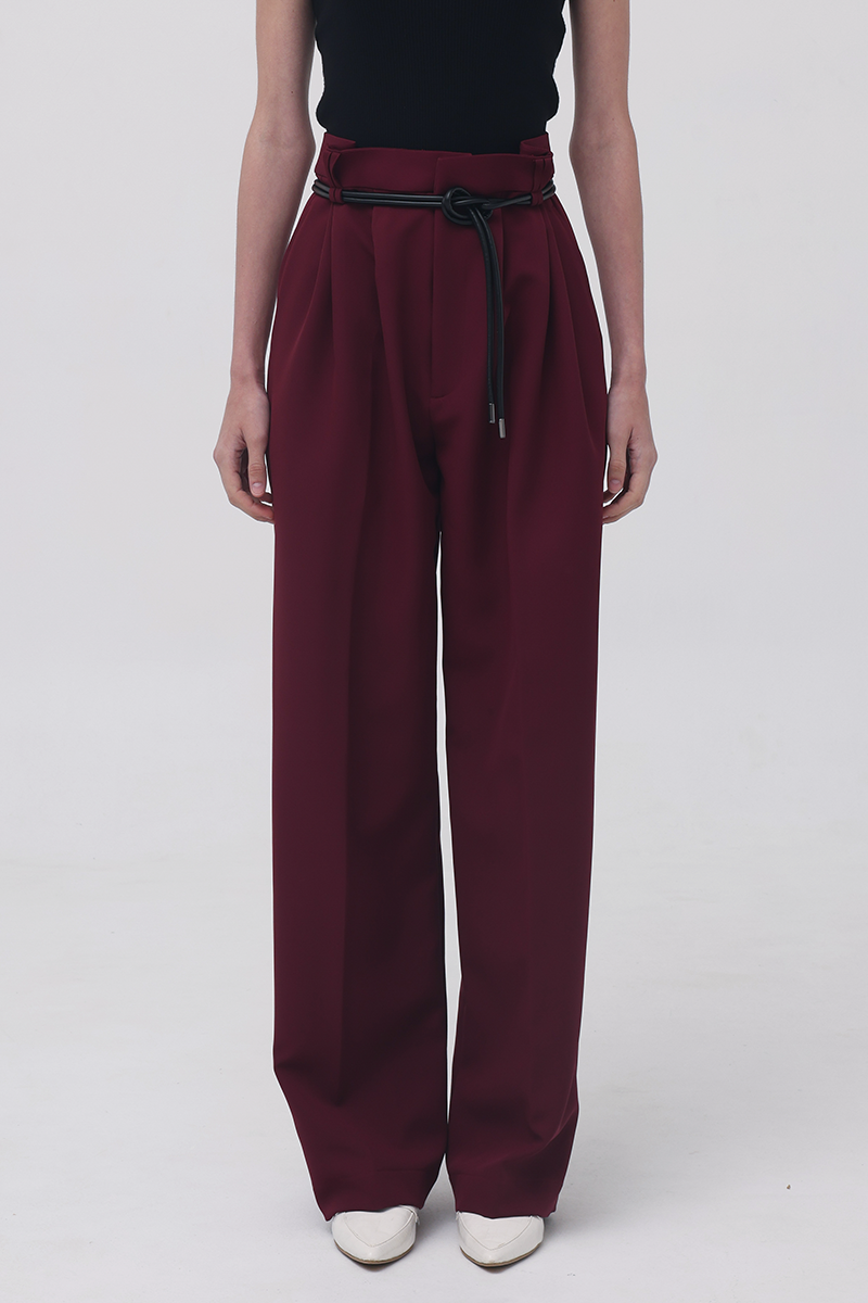 The Maroon Mr. Geoff offers a more standout look with that deep maroon tone. Cut from smooth semi-wool, the pants fall in straight, creating an effortlessly elongated silhouette.
