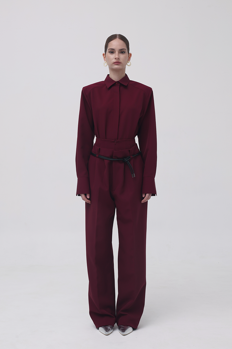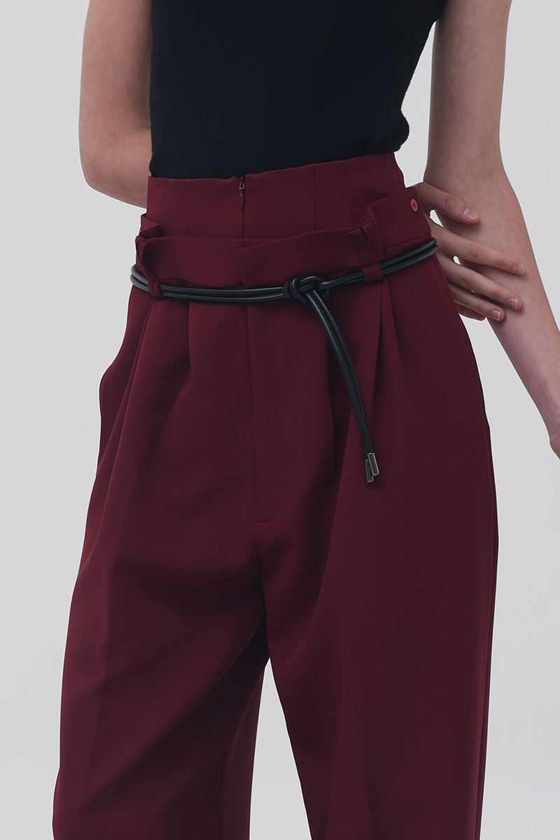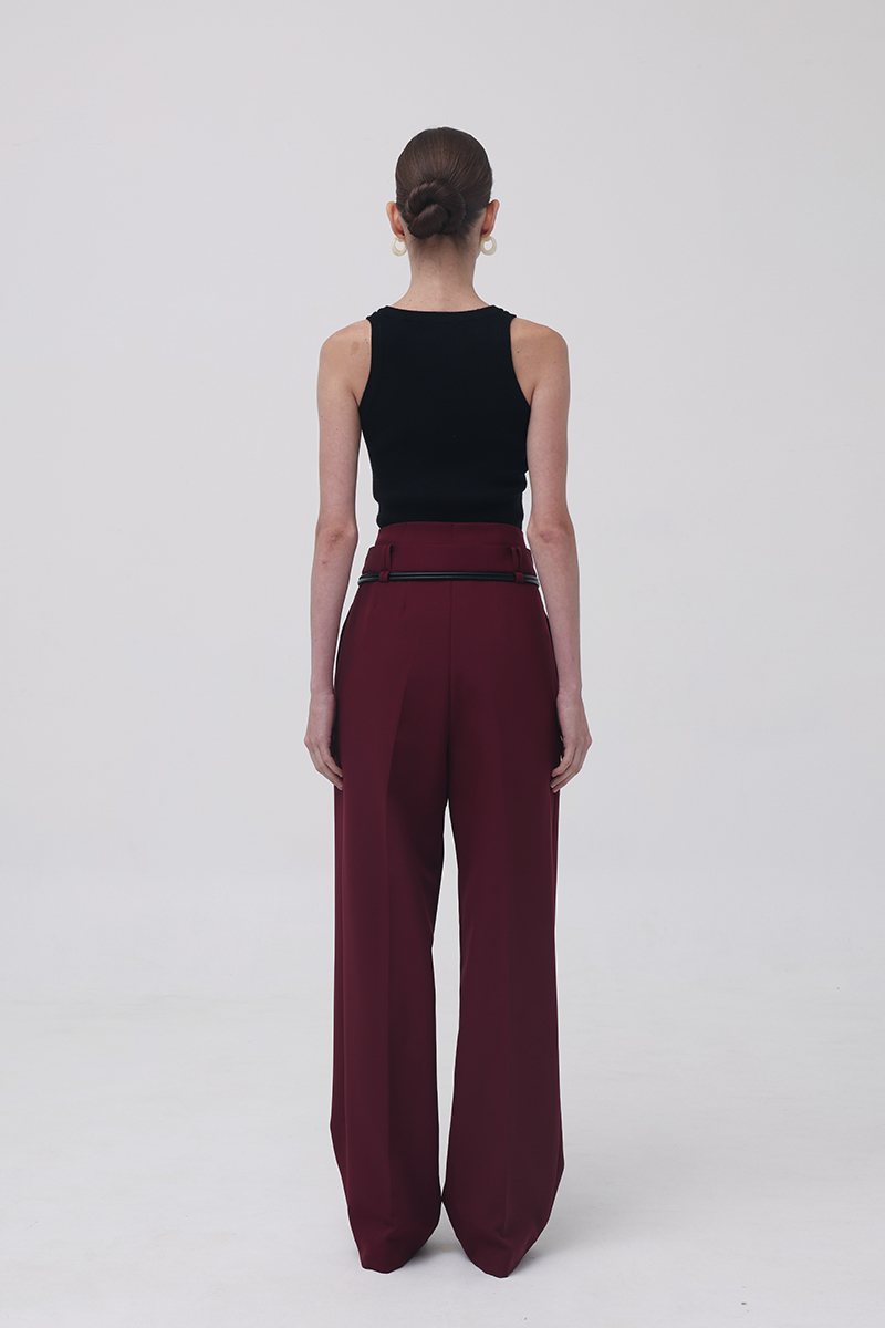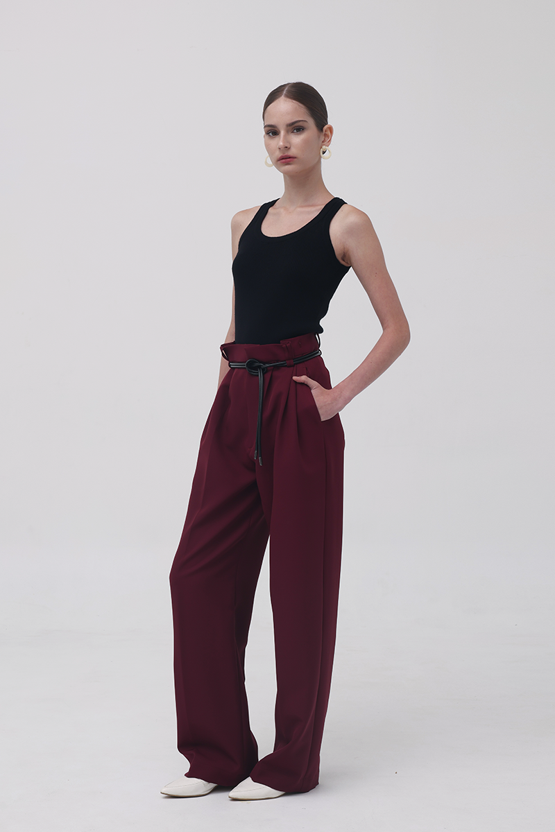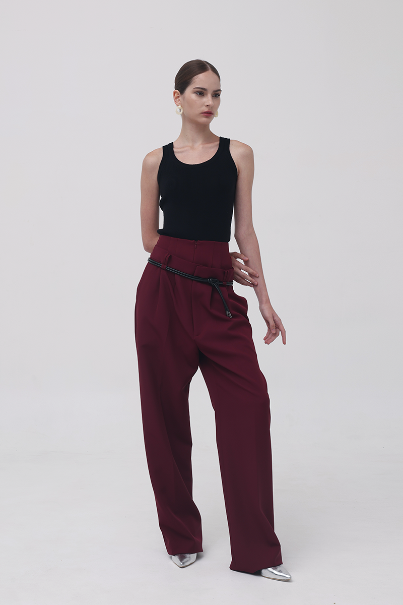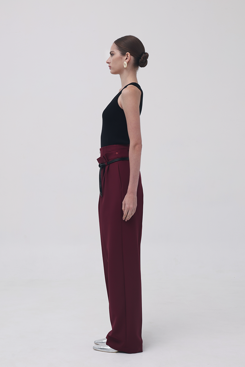 The Maroon Mr. Geoff offers a more standout look with that deep maroon tone. Cut from smooth semi-wool, the pants fall in straight, creating an effortlessly elongated silhouette.