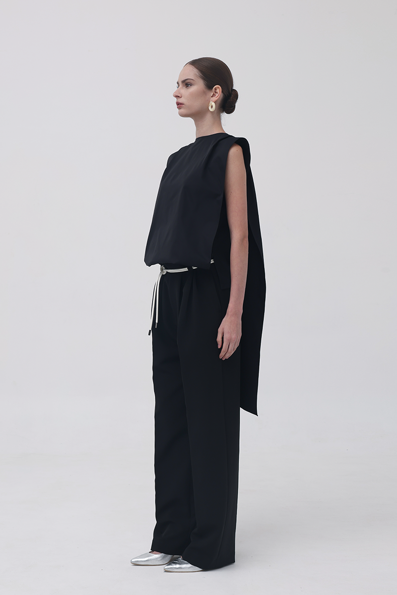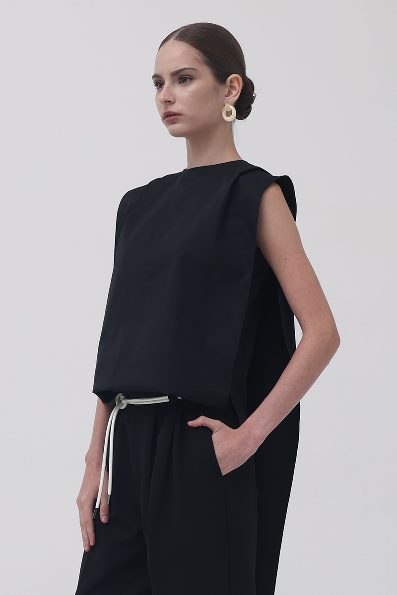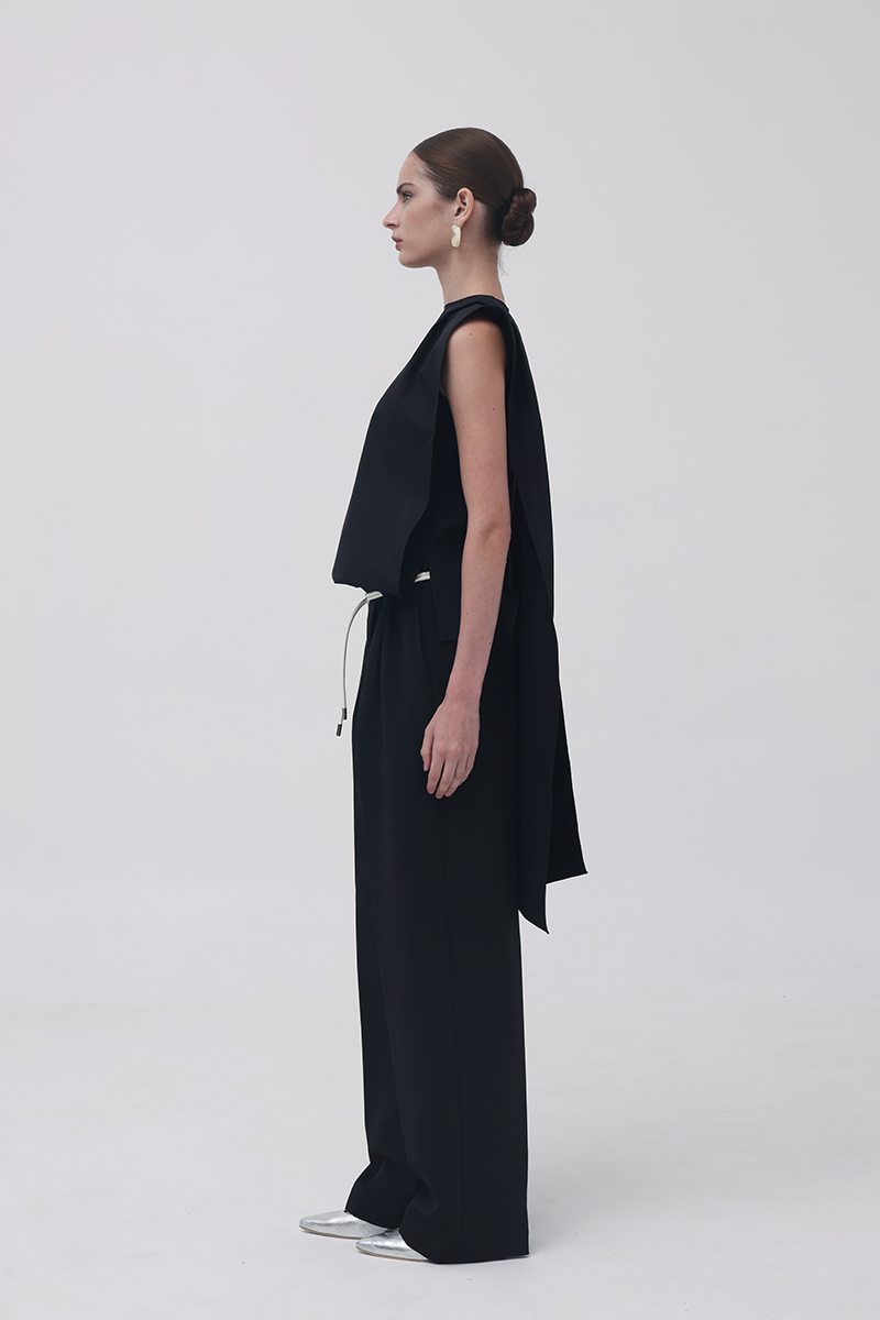 The Black 13th Flipped Top redefines structure with its boxy, square silhouette. Retaining the same sculptural, boxy silhouette as its beige counterpart, this version exudes quiet confidence in black — a color that adds a refined, classic edge to its architectural form. The design features an elongated apron-like front and a long scarf detail that can be flipped over the shoulder.
