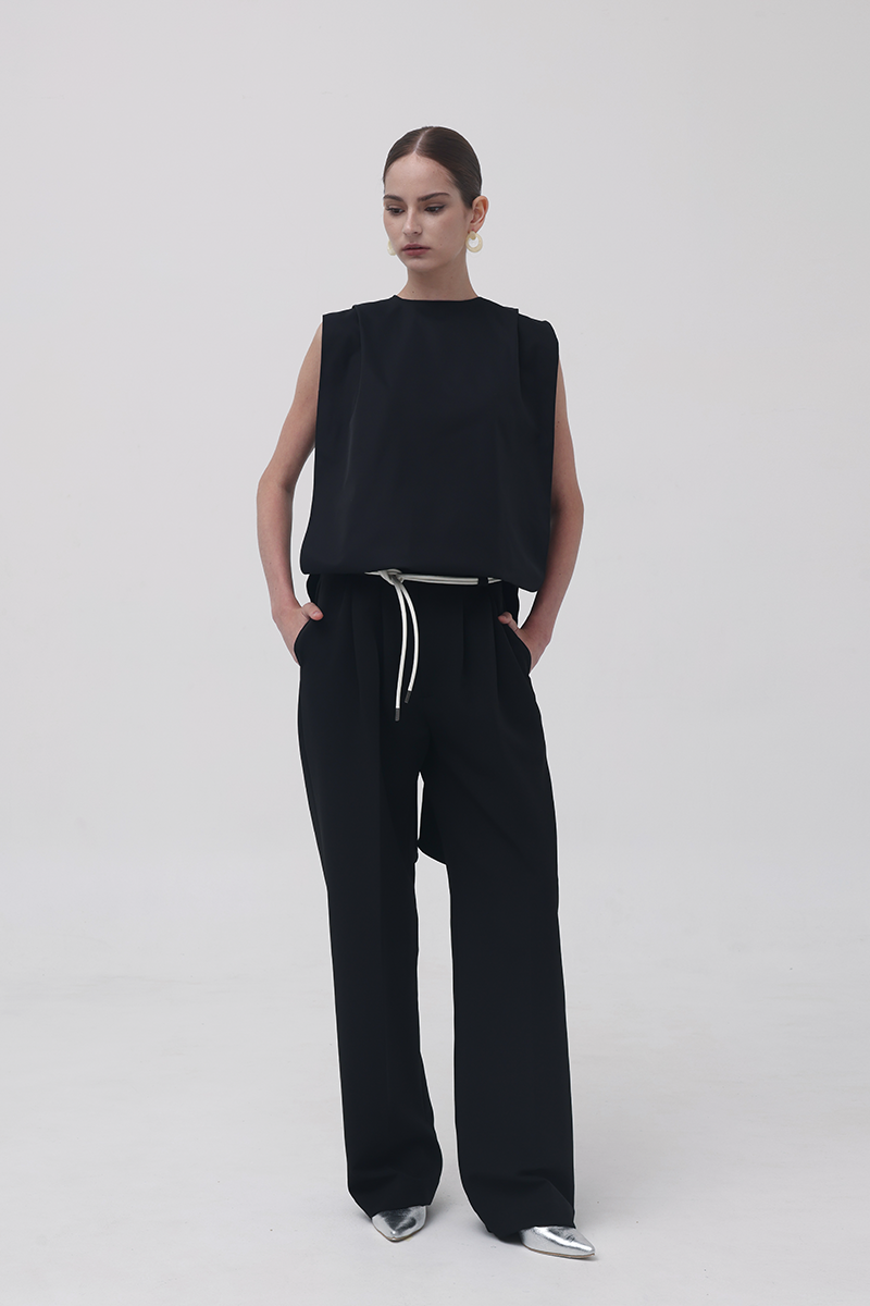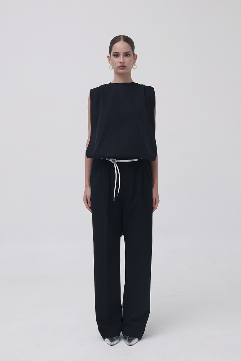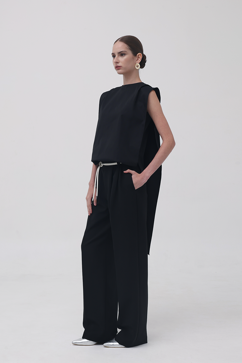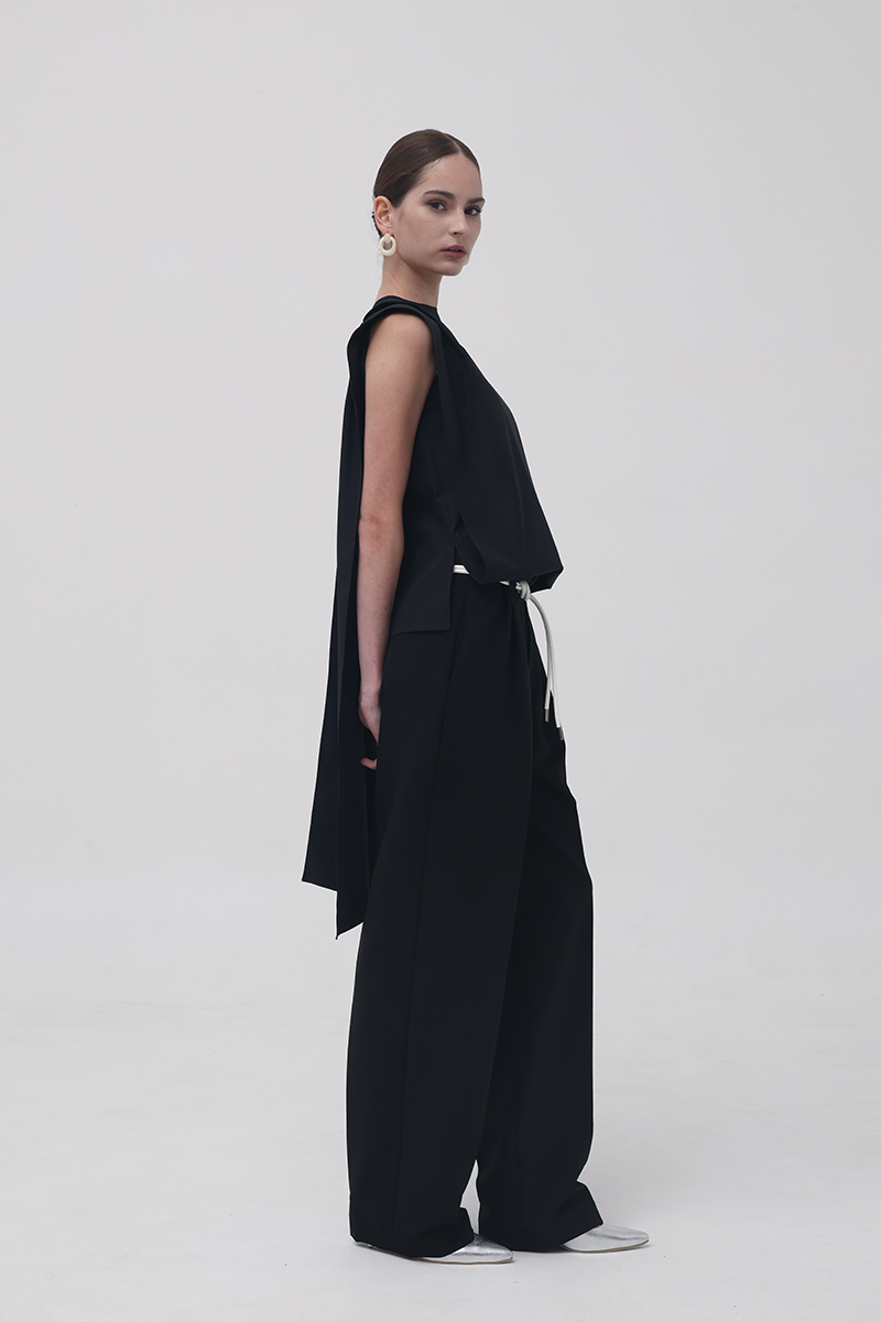 The Black 13th Flipped Top redefines structure with its boxy, square silhouette. Retaining the same sculptural, boxy silhouette as its beige counterpart, this version exudes quiet confidence in black — a color that adds a refined, classic edge to its architectural form. The design features an elongated apron-like front and a long scarf detail that can be flipped over the shoulder.