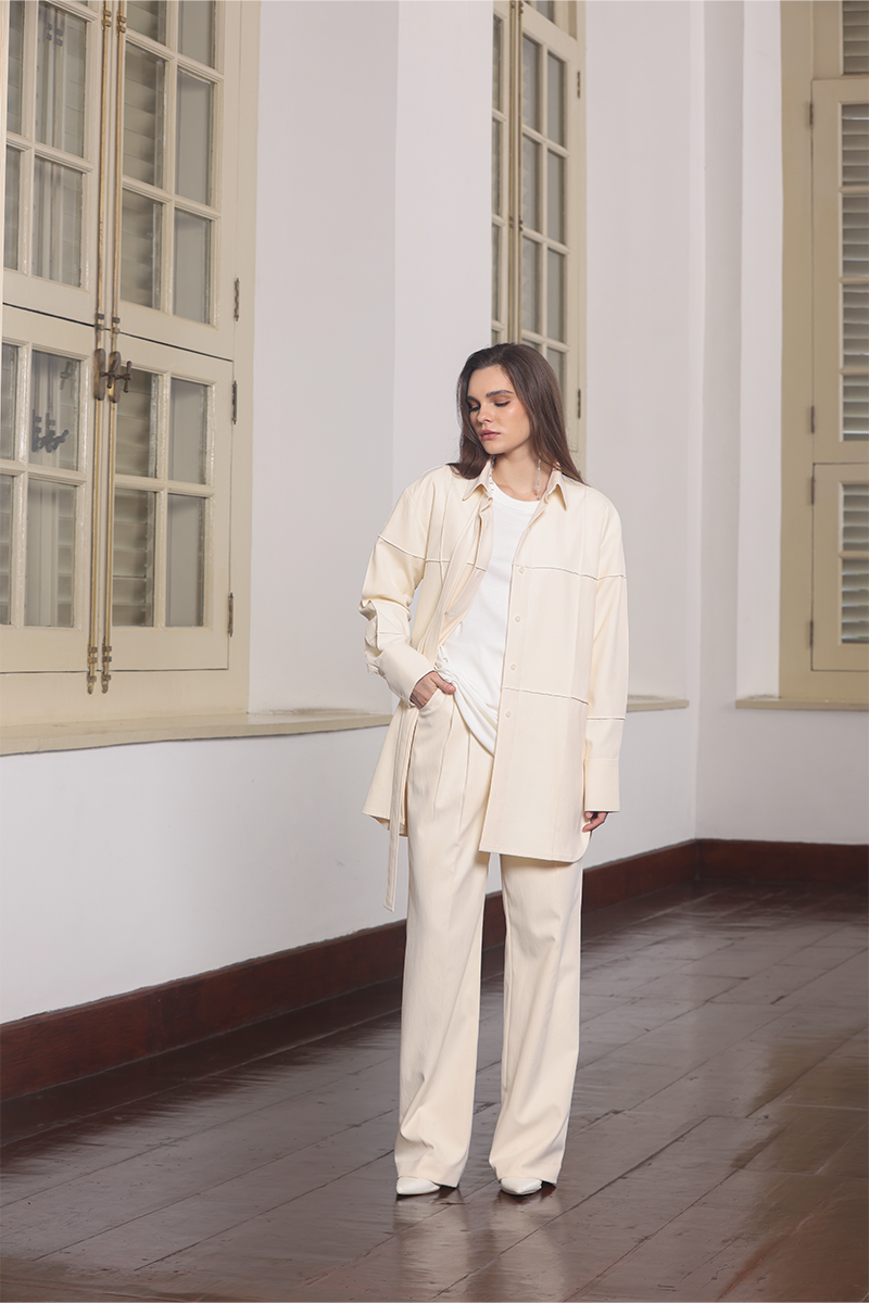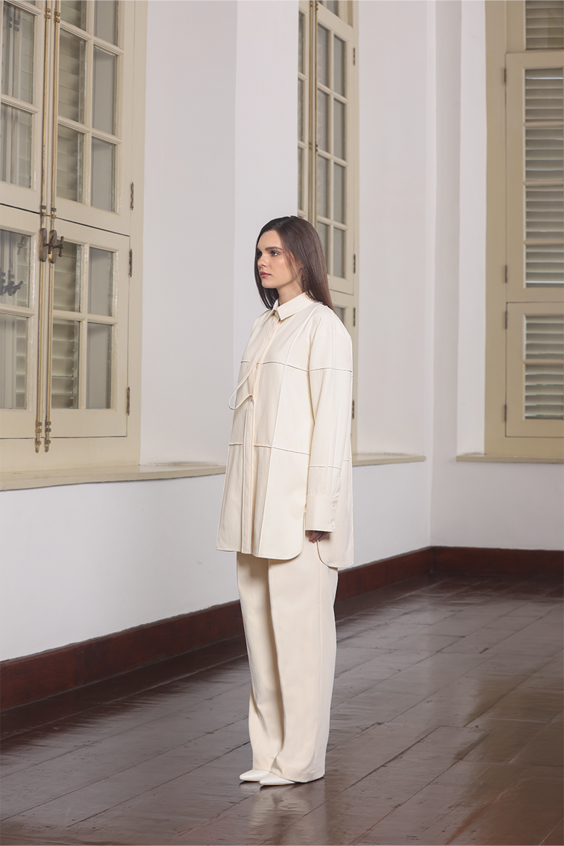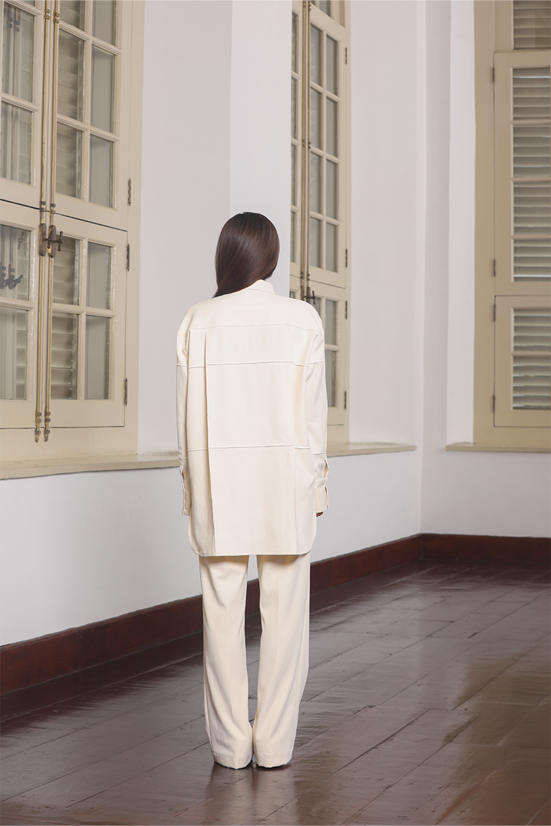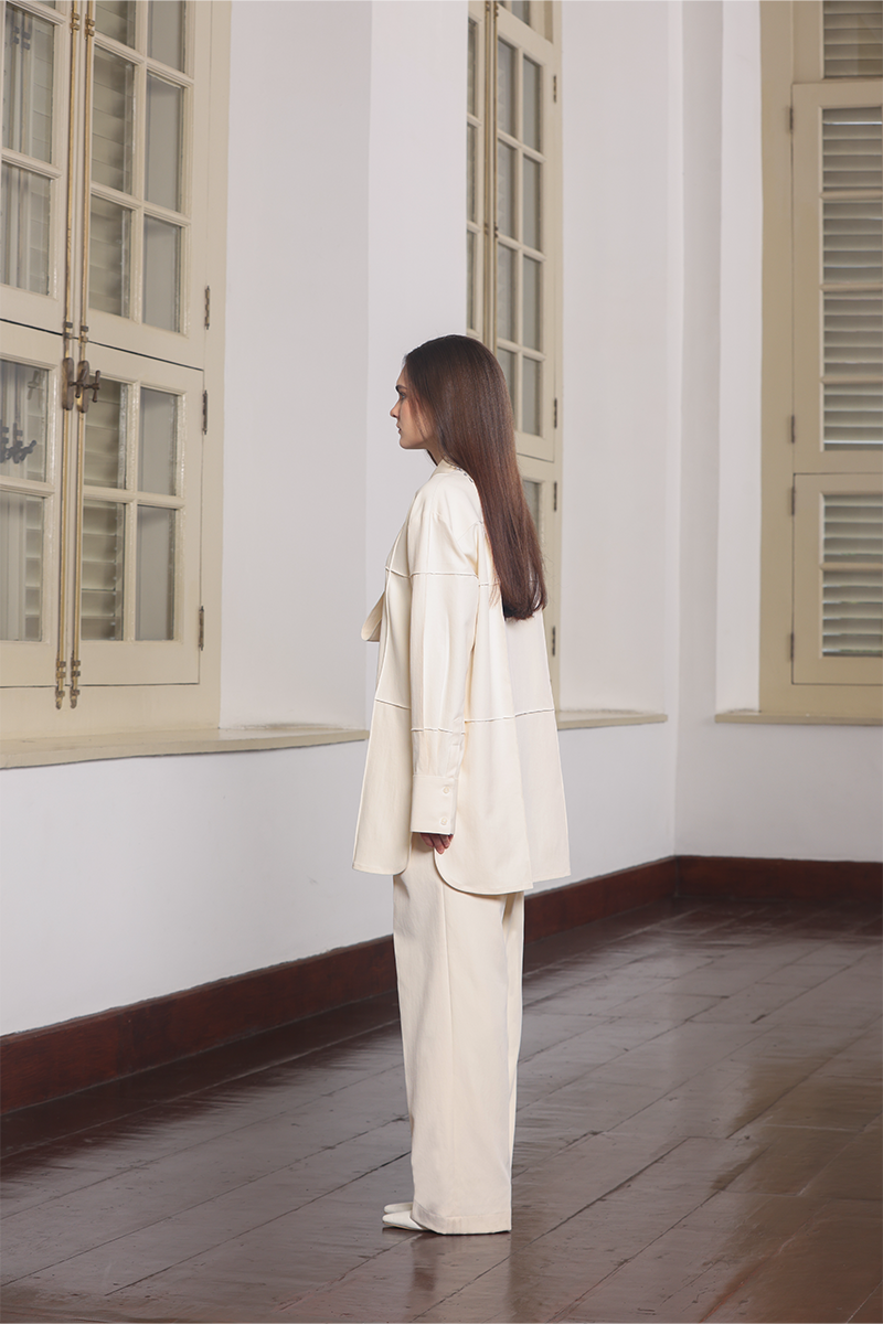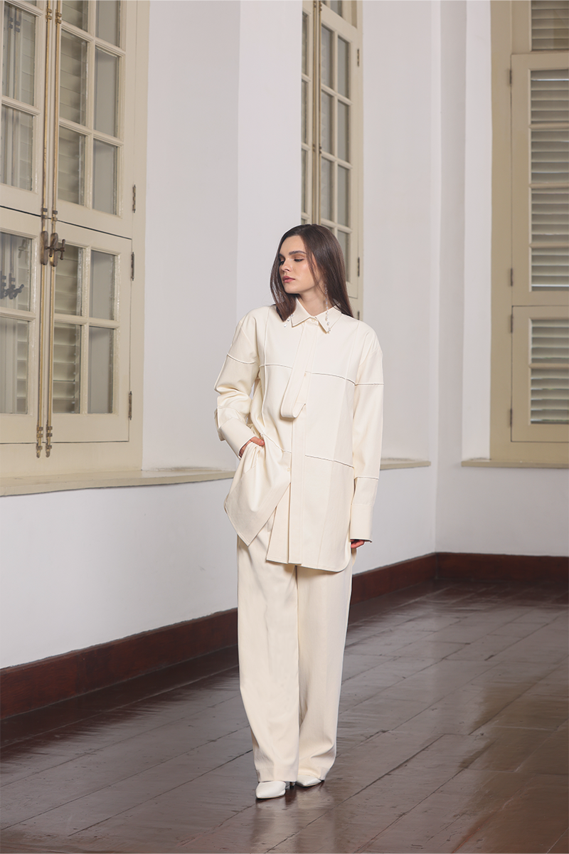 Wear it loose for a relaxed statement, or style it with tailored pants for a more composed look. Paired with the matching Creme Flatpeplum Pants or worn as a standalone piece, it is designed for office days, creative meetings, and any moments in between.