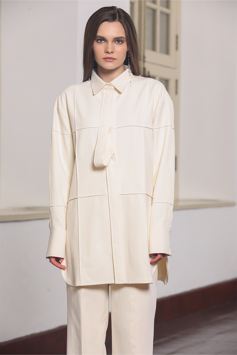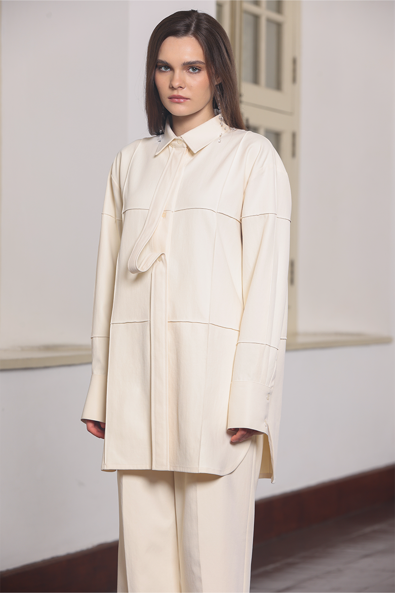 The Creme Seven Folded Shirt is crafted from a cotton-polyester blend, offering a smooth structure with a soft drape. Designed in an oversized silhouette, it features subtle stitched paneling and a distinctive tie detail with buttonholes that can be fastened in multiple ways.